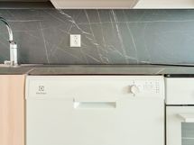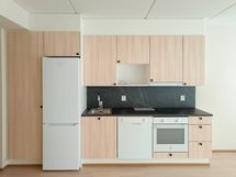 Jääkaappi/pakastin, erillisuuni- ja taso, astianpesukone. Lattia: Puu. Seinät: Maalattu