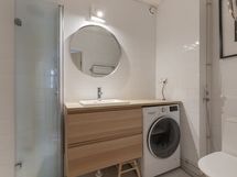 - Pesutilojen varusteet: WC-istuin, suihku, suihkuseinä, pesukoneliitäntä, pesukone, patterikuivain, allaslaatikosto, kaappi, lattialämmitys, pesuallas, peili ja bidee-suihku. Pesutilojen kuvaus: Pesukone on jäämässä vuokralaiselle.