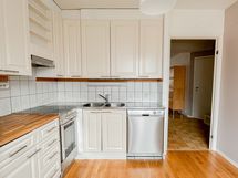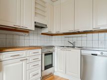 - Tilaa isolle ruokapöydälle, Suuri tiskipöytä, Paljon kaappitilaa, Puutasot, Terästasot, Astianpesukone, Keraaminen liesi, Liesituuletin, Jää-pakastinkaappi