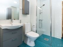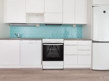 Asuintilojen lattiat ovat vaalean harmaata tammilaminaattia. Keittiön kaapistojen ovet ovat raikkaan valkoiset ja ylä- ja alakaappien välinen tila on laatoitettu vaalealla veden vihreällä laatalla. Työtaso on harmaan tammen sävyistä laminaattia. Varustukseen kuuluu keraaminen liesi, astianpesukone ja kylmälaitteet. Kokonaan laatoitetun kylpyhuoneen seinät ovat puhtaan valkoiset ja lattia turkoosi. Kylpyhuoneen kalusteet ovat vaalean harmaita. Pesukoneelle ja kuivausrummulle on tilavaraus.
