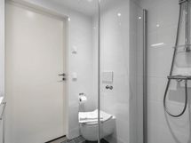 Varustus: suihkuseinä, pesukoneliitäntä, lattialämmitys, wc-istuin, peilikaappi, kiinteät valaisimet.