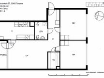 Asunnossa on harmahtava laminaattilattia ja maalatut seinät. Keittiön valkoiset kaapistot puureunalistoin sekä vaalean puunsävyinen työtaso luovat ajattoman ilmeen. Varusteluun kuuluu jääpakastinkaappi ja tila astianpesukoneelle. Olohuoneesta on kulku lasitetulle parvekkeelle, ja erillinen vaatehuone tuo runsaasti säilytystilaa. Laatoitettu kylpyhuone on varustettu pyykinpesukoneelle sopivalla tilalla.