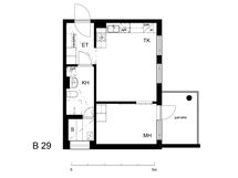 Ilmoituksen kuvat ovat mallikuvia talon muista kaksioista, materiaalit saattavat erota. Yhtiöjärjestyksen mukainen huoneistotyyppi on 1 h + tupak + s + p.