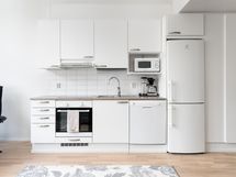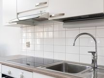 - Liesi: keraaminen, erillisuuni. Työtasot: laminaatti. Kylmäsäilytys: jääkaappi/pakastin. Varustus: liesituuletin, astianpesukone. Keittiössä valkoiset kaapinovet ja laminaatti työtaso.
