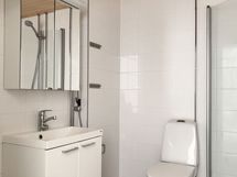 Kylpyhuone on tilava ja kauttaaltaan laatoitettu. Lattiassa on tyylikäs harmaa sävy ja seinät ovat valkoiset. Tilassa on varaus pyykinpesukoneelle, mikä helpottaa arkea. Myös eteinen on reilun kokoinen ja tarjoaa hyvin kaappitilaa säilytykseen.