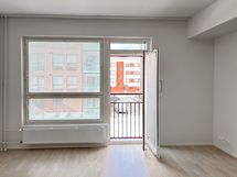 Asunnossa on vaaleat lattiat ja valkoiset keittiönkaapistot, jotka tuovat tilaan raikkautta ja valoisuutta. Oleskelutila on hyvän kokoinen ja muuntautuu moneen tarpeeseen. Isot ikkunat päästävät runsaasti luonnonvaloa sisään, ja ranskalainen parveke lisää avaruuden tuntua.