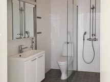 Kylpyhuone on tilava ja kauttaaltaan laatoitettu. Lattiassa on tyylikäs harmaa sävy ja seinät ovat valkoiset. Tilassa on varaus pyykinpesukoneelle, mikä helpottaa arkea. Myös eteinen on reilun kokoinen ja tarjoaa hyvin kaappitilaa säilytykseen.