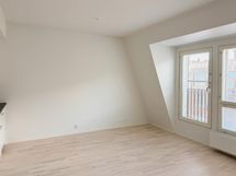 Asunnossa on vaaleat lattiat ja valkoiset keittiönkaapistot, jotka tuovat tilaan raikkautta ja valoisuutta. Oleskelutila on hyvän kokoinen ja muuntautuu moneen tarpeeseen. Oleskelutilan vino seinä tuo asuntoon persoonallista ilmettä. Isot ikkunat päästävät runsaasti luonnonvaloa sisään, ja ranskalainen parveke lisää avaruuden tuntua.
