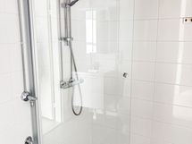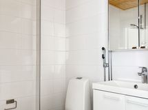 Kylpyhuone on tilava ja kauttaaltaan laatoitettu. Lattiassa on tyylikäs harmaa sävy ja seinät ovat valkoiset. Tilassa on varaus pyykinpesukoneelle, mikä helpottaa arkea. Myös eteinen on reilun kokoinen ja tarjoaa hyvin kaappitilaa säilytykseen.