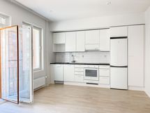 Asunnossa on vaaleat lattiat ja valkoiset keittiönkaapistot, jotka tuovat tilaan raikkautta ja valoisuutta. Oleskelutila on hyvän kokoinen ja muuntautuu moneen tarpeeseen. Isot ikkunat päästävät runsaasti luonnonvaloa sisään, ja ranskalainen parveke lisää avaruuden tuntua.