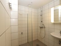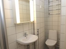 Varustus: suihkuseinä, pesukoneliitäntä, wc-istuin, suihku, peilikaappi, kiinteät valaisimet.