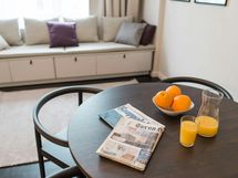 In this two-bedroom apartment you’ll find a convenient kitchen island that is equipped with a stovetop, refrigerator, dishwasher, microwave oven, coffee machine, water kettle and tableware. For comfort, there is an elegant private bathroom and shower along with a hairdryer. Relaxing nights are provided by four single beds. There is a complimentary Wi-Fi connection as well as bed linen and towels.
