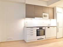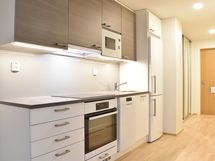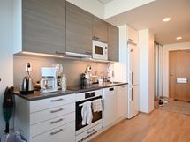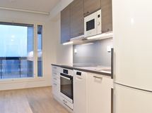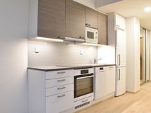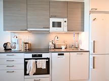 Keittiössä on tyylikkäät kaapit, työtasot, välitilassa puhtaanvalkoista lasia led-valoilla ja laadukkailla kodinkoneilla. Vakiovarustukseen kuuluu mm. astianpesukone, induktiokeittotaso, valkoinen erillisuuni ja jääkaappipakastin.