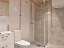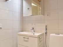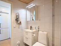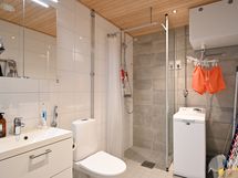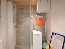 Pesuhuoneen lattia on himmeää tummanharmaata Iaattaa, seinät iso valkoista kiiltävää vaakaan asennettua laattaa, yhdellä seinällä tehostelaattana harmaata laattaa, katto on paneelia, peilikaappi led-valolla, valkoinen allaslaatikosto valkoisella altaalla ja kirkas suihkuseinä. Pesukoneelle ja kuivausrummulle on tilavaraus ja liitännät.