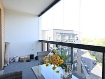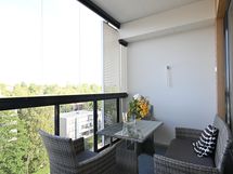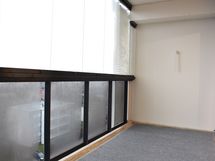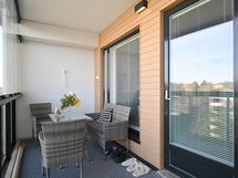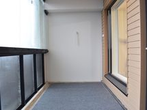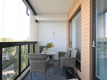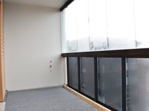 Ikkunoissa on valkoiset sälekaihtimet. Lasitetulla parvekkeella on alasvalovalaisin, lattialla harmaasävyinen matto sekä tuuletustanko.