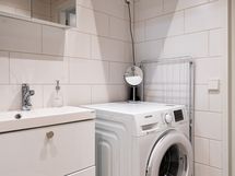 Huoneiston pintamateriaalit: lattia tammilaminaattia, seinäpinnat tasoitettu ja maalattu ja kattopinnat ruiskutasoitettu ja maalattu. Keittiön varustelu: laadukkaat rosteripintaiset Electroluxin kodinkoneet: jääkaappipakastin, keittotaso, liesituuletin, kalusteisiin asennettu erillisuuni ja astianpesukone. Kaapinovet valkoisia kiiltäviä kalvo-ovia ja mikroaaltouunille on tilavaraus. Työtaso suorareunaista ns. cappuccinon väristä kivitasoa. Välitilassa kiiltävä valkoinen välitilalaatta. Kylpyhuoneen pintamateriaalit: lattia keraamista laattaa, seinäpinnat keraamista mattavalkoista seinälaatta ja katossa puupaneeli. Kylpyhuoneen varustelu: ovellinen pesuallaskaappi, peilikaappi led-valoilla, suihkuseinä kääntyvällä ovella, suihku ja pyykinpesukoneliitäntä.