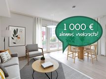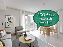 KAMPANJA: Alennus vuokrasta -100 €/kk ensimmäisen asumisvuoden ajaksi. Alennus lasketaan ilmoituksessa olevasta vuokrasta. Kampanjan ehdot: ensimmäinen mahdollinen irtisanomispäivä on 11 kk vuokrasopimuksen aloituksesta.
