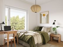 Kodin kookkaat ikkunat ja parveke tekevät siitä ihanan valoisan. Asunnossa on hyvin valmista säilytystilaa niin makuuhuoneiden kuin eteisen puolella. Makuuhuoneet ovat käytännöllisesti mitoitettuja, joten niitä molempia voi hyödyntää niin makuuhuoneena kuin työhuoneena. Toinen makuuhuone on kuitenkin tilavampi ja sinne mahtuu hyvin sängyn lisäksi erillinen työpiste. Lisäksi kodissa on valmiiksi asennetut verhokiskot. Lattiamateriaalina on kestävä ja klassinen tammilankkulaminaatti ja seinät ovat valkoiset.