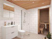 - Tyylikäs kylpyhuone Temalin kalusteilla ja Pukkilan laatoilla sekä viihtyisä sauna