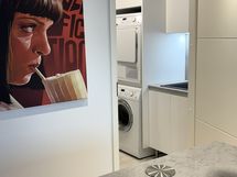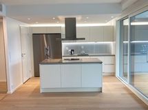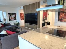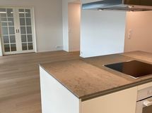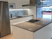 - Työtasot: kivi. Keittiökaapistot valkoiset Aran Cucine kalusteet, työtasot harmaata kivikomposiittia, allas alta kiinnitetty harmaa Franke, integroidut Mielen kodinkoneet: JK, PK, APK, mikro, induktioliesitaso, uuni (pyrolyysi), saarekeliesituuletin