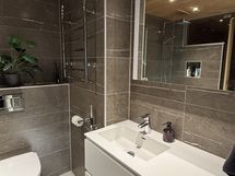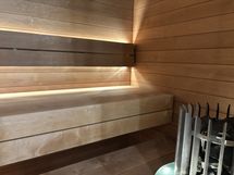 - Kuvaus: Kylpyhuoneen yhteydessä tervaleppäpaneloitu sauna, lauteeseen integroitu kiuas, lasiovi, laattalattia.