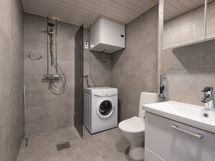 Suihku, Suihkuseinä, Pesukonevalmius, Peilikaappi, Allaskaappi, Laattalattia, Halogeenivalot, Laattaseinä, Lattialämmitys