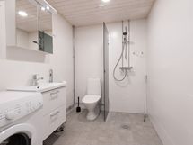- Suihku, Suihkuseinä, Pesukonevalmius, Peilikaappi, Allaskaappi, Laattalattia, Halogeenivalot, Laattaseinä, Lattialämmitys