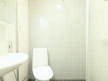 Kylpyhuone on kokonaan kaakeloitu ja siellä on liitännät pyykinpesukoneelle.