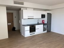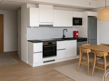 - Keittiön varusteet: Jääkaappipakastin, erillisuuni, liesi, liesituuletin, astianpesukone ja mikroaaltouuni. Liesi: Induktioliesi. Työtason materiaali: Kivi.