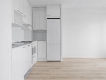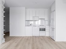 Keittotila yhdistyy saumattomasti olohuoneeseen ja siellä on astianpesukone, perinteinen liesi tuulettimineen ja jääkaappi-pakastin. Tilavassa, laatoitetussa kylpyhuoneessa on paikka pesukoneelle.
