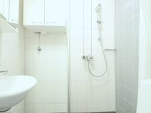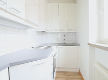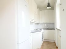 Keittokomero on kompakti ja valoisa. Kylpyhuone on kaakeloitu, ja siellä on liitännät pesukoneelle.