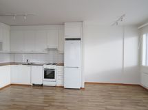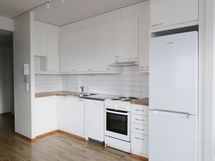 Keittotilassa valkoiset kaapit ja välitilassa valkoista laattaa. Varustukseen kuuluu liesi, liesituuletin, jääkaappipakastin ja tilavaraus astianpesukoneelle sekä mikrolle.