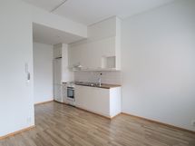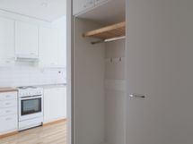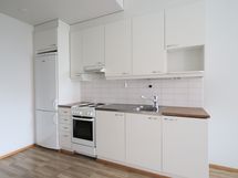 Keittotilassa valkoiset kaapit ja välitilassa valkoista laattaa. Varustukseen kuuluu liesi, liesituuletin, jääkaappipakastin ja tilavaraus astianpesukoneelle sekä mikrolle.