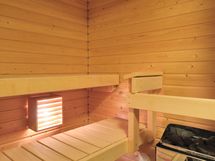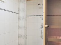 Tilavan pesuhuoneen lattia on tummaa laattaa ja seinät pääosin valkoista laattaa. Pesuhuoneessa on valkoinen allaskaappi, peilikaappi valolla, suihku ja oma sauna. Pesukoneelle on liitännät ja tilavaraus.