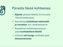 Tämä yksiö sopii erinomaisesti menevälle asukkaalle, joka kaipaa elämäänsä helppohoitoista ja kompaktia kotia, jossa on silti mukavaa viettää aikaa. Talo sijaitsee Pukkilan vanhan kaakelitehtaan alueelle rakentuvalla uudella asuinalueella pientaloalueen helmassa, lähellä monipuolisia palveluita ja liikuntamahdollisuuksia. Laajakaista 50 Mbit/s sisältyy vuokraan | Lemmikit ovat tervetulleita | Vakuus 0 €! Tässä kodissa parasta: - Kookkaat ikkunat, jotka tekevät tilasta ihanan valoisan - Laadukkaat materiaalit ja varusteet mm. astianpesukone - Tyylikäs kylpyhuone Pukkilan laatoilla ja tilavarauksella pyykinpesukoneelle - Toimiva ja tehokas pohja, neliöt hyödynnetty hyvin - Ranskalainen parveke Asunto tuntuu käytännöllisen pohjaratkaisunsa ja kookkaan ikkunansa ansiosta neliöitään tilavammalta. Kodin pintamateriaalien neutraalit sävyt antavat sinulle mahdollisuuden sisustaa siitä juuri oman näköisesi. Helppohoitoinen keittiö, riittävä säilytystila sekä tilava ja toimiva kylpyhuone auttavat sinua pitämään kodin järjestyksessä ja antavat sinulle tilaa keskittyä muihin asioihin. Keittiön ilme on raikas ja moderni. Laadukkaat materiaalit ja kodinkoneet tekevät ruoanlaitosta helppoa ja miellyttävää. Lisäksi tilassa on valmiiksi tiskikone. Viimeisen silauksen luovat kauniit ja käytännölliset kvartsitasot. Kylpyhuoneessa on käytetty alueen historiaan sopivia ja laadukkaita Pukkilan laattoja. Löydät kylpyhuoneesta myös tilavarauksen pyykinpesukoneelle. Kodin asuinhuoneen runsas ikkunapinta sekä ranskalainen parveke tekevät siitä ihanan valoisan ja avaran. Asunnossa on valmista säilytystilaa niin asuinhuoneen kuin eteisen puolella. Lisäksi kodissa on valmiiksi asennetut verhokiskot. Lattiamateriaalina on kestävä ja klassinen lankkulaminaatti. Pysäköinti: Parkkipaikan vuokraus tapahtuu AimoParkin asukaspysäköinnin kautta. Parkkipaikan saatavuus ja tarkemmat tiedot tulee aina varmistaa Aimo Parkilta; asukaspysakointi@aimopark.fi, 0207812480. Lisätietoja tarvittaessa juli@juliliving.com. Kaarnan asukkaiden käytössä ovat viereisestä talosta löytyvät talosaunaosasto ja Juli Lounge sekä oman talon tiloissa sijaitseva pesula. Korttelin sisäpihalle valmistuu yhteiskäyttöön tarkoitettu ulkokuntoilualue sekä leikkipaikka. Juli-koti on valintana ympäristöystävällinen, sillä käytämme vain vihreää sähköä ja optimoimme rakennuksen energiankäyttöä tekoälyllä. Pukkilan Kaarnan energiatehokkuusluokka on A, kohde lämpenee maalämmöllä ja talon katolle asennetaan aurinkopaneeleja kiinteistön sähköntuotantoa varten. Kohteelle haetaan LEED Platina -ympäristösertifikaattia. Asunnoissa on patterilämmitys ja koneellinen ilmanvaihto. Vesimaksu määräytyy kulutuksen mukaan ja ei sisälly vuokraan. Jokaisessa huoneistossa on huoneistokohtainen vedenmittaus. Vuokraa koti suoraan verkosta! Kuvat ovat suuntaa antavia havainne- sekä valokuvia ja voivat siten olla vastaavasta asunnosta tai pohjan peilikuvasta eri kerroksessa tai rapussa. Kuvat voivat olla peräisin myös muista Julin Pukkilan korttelin taloista – tutustuthan pohjaratkaisuun huolellisesti. Asunnot vuokrataan kalustamattomana. Vuokraan sisältyy laajakaista 50 Mbit/s. Talo on savuton, joten tupakointi asunnoissa, parvekkeilla ja talon yhteisissä sisä- ja ulkotiloissa on kielletty. Tupakointi sallittu vain sille osoitetulla paikalla.