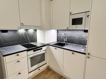 - Keittiön varusteet: Jääkaappipakastin, erillisuuni, liesi, liesituuletin, astianpesukone ja mikroaaltouuni. Liesi: Induktioliesi. Työtason materiaali: Laminaatti. Keittiön kaapistot mattalakattu melamiini white matt, runko valkoinen melamiini. Ligo rst nuppivedin, työtaso Pietra grigia black laminaatti, välitila Pietra grigia black 12mm laminaattipintainen välitilalevy. Karelian kolmisauvainen parkettilattia (Tammi Helsinki Vanilla Matt), jalkalistat valkoiset, seinät valkoiseksi maalatut (Tikkurila Paperi). Electroluxin induktioliesi, erillisuuni, jääkaappipakastin, astianpesukone ja mikroaaltouuni.