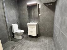 - Pesutilojen varusteet: Suihkuseinä, lattialämmitys, allaskaappi, peilikaappi ja pesukoneliitäntä. Pesutilojen kuvaus: Seinälaatta Europe black 30x60, lattialaatta Europe black 10*10, katto tervaleppäpaneelia, kääntyvä kirkas suihkuseinä.