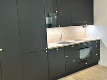 - Keittiön varusteet: Jääkaappipakastin, erillisuuni, liesi, liesituuletin, astianpesukone ja mikroaaltouuni. Liesi: Induktioliesi. Työtason materiaali: Laminaatti. Keittiön kaapistot Jet Black matt, runko valkoinen melamiini. Irtosivut, täytteet ja sokkelit oven väriset. Ligo messinki nuppivedin, työtaso Vicensa Oak laminaatti, välitila Vicensa Oak 12mm laminaattipintainen välitilalevy. Karelian kolmisauvainen parkettilattia (Tammi Helsinki Vanilla Matt), jalkalistat valkoiset, seinät valkoiseksi maalatut (Tikkurila Paperi). Electroluxin induktioliesi, erillisuuni, jääkaappipakastin, astianpesukone ja mikroaaltouuni.
