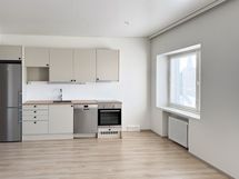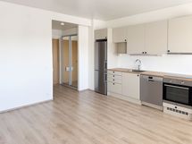 Kompaktit neliöt on käytetty tehokkaasti. Avoin olohuone-keittiö luo helpon ja joustavan pohjan sisustukselle, ja makuuhuone on erotettu tilaa säästävällä liukuovella. Makuuhuoneen päädyssä sijaitseva vaatehuone sekä eteisen kaapistot tuovat runsaasti säilytystilaa. Kodikas tammilaminaatti ja beigen sekä lämpimän puun sävyt toistuvat keittiössä, jossa antiikinruskeat nuppivetimet tuovat persoonallisen, vanhan ajan hengen. Kylpyhuoneen valkoisen ja harmaan ajaton laatoitus saa kontrastia trendikkäästä betonisävyisestä tehostelaatasta.