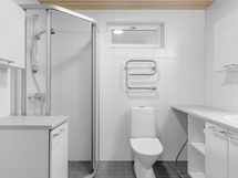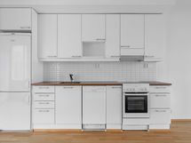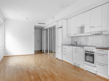 Asuinhuoneen parkettilattiat ovat jalan alla ihanan lämpimät vesikiertoisen lattialämmityksen ansiosta. Kylpyhuone on kaakeloitu. Keittiökaapistot ovat valkoiset ja työtasot pähkinäpuuta mukailevaa laminaattia. Asunnon vakiovarustukseen kuuluvat astianpesukone, jää-pakastinkaappi, keraaminen liesi sekä mikroaaltouuni.