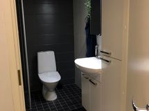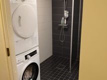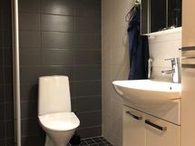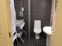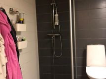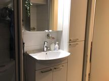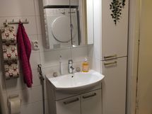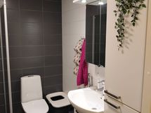 Suihku, Suihkuseinä, Pesukonevalmius, Peilikaappi, Allaskaappi, Rättipatteri, Laattalattia, Laattaseinä, Halogeenivalot