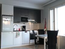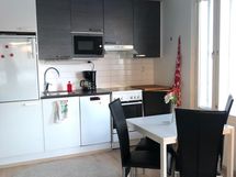 Paljon kaappitilaa, Suuri tiskipöytä, Halogeenivalot, Laminaattitasot, Integroidut koneet, Astianpesukone, Keraaminen liesi, Liesituuletin, Jää-pakastinkaappi