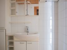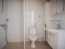Pesutilojen varusteet: Pesukoneliitäntä, wc-istuin, suihku ja peilikaappi. Pesutilojen kuvaus: laatoitettu, lattialämmitys.