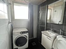Suihku, Suihkuseinä, kuivaava pyykinpesukone, Peilikaappi, Allaskaappi, Laattalattia, Laattaseinä, Avattava ikkuna, Lattialämmitys