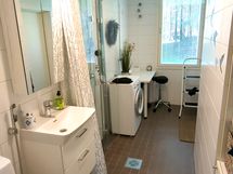 - Suihku, Pesukonevalmius, Laattaseinä, Laattalattia, Lattialämmitys, Suihkuseinä, Avattava ikkuna