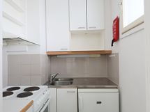 Ikkunallisessa keittokomerossa valkoiset kaapit metallivetimin. Työtaso osin rosteria ja osin vaaleaa laminaattia, välitila laattaa. Varusteluina jääkaappi, liesi, liesituuletin ja tilavaraus mikroaaltouunille.