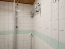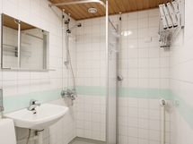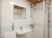 Pesuhuoneen seinät valkoista kaakelia vihertävällä tehosteraidalla. Lattia muovimattoa. Pesuhuoneessa suihku sekä suihkuseinäke, peili, pesuallas, bidee ja wc istuin. Omalle pyykinpesukoneelle on hyvä tila ja liitäntä.