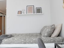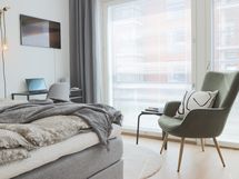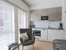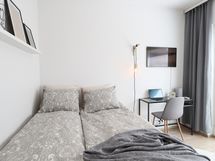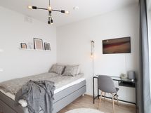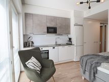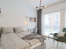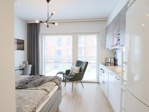 Modern 20m² studio next to Logomo event venue. Fully furnished with equipped kitchen, washing machine, smart-TV, Wi-Fi. Great location: Turku Market Square <1km, bus/train station within sight.
