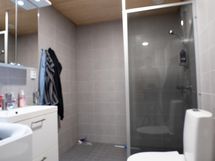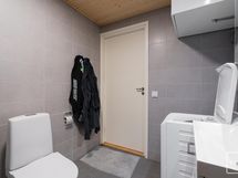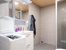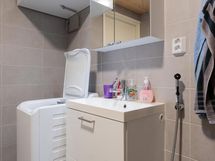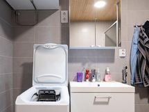 - Pesutilojen varusteet: WC-istuin, suihkuseinä, pesukoneliitäntä, lattialämmitys, peilikaappi, allaskaappi ja bidee-suihku.