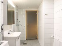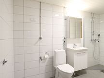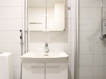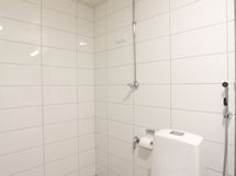 Laatoitettu kylpyhuone, jossa suihku, suihkuseinä, peilikaappi, allaskaappi, wc-istuin ja pk-liitäntä